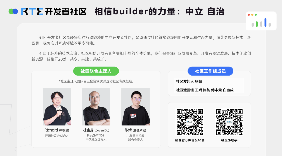关注我们的社区媒体帐号 —— 微信公众号@RTE 开发者社区、视频号@RTE 开发者社区,以及各种主流非主流的技术平台、社区的同名账号。