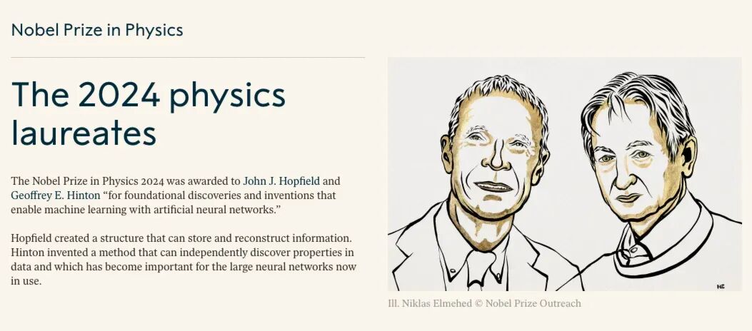 10 月 8 日,2024 年诺贝尔物理学奖正式公布。获奖者为 John Hopfield 与 Geoffrey Hinton,以表彰他们在人工神经网络机器学习方面的基础性发现和发明。