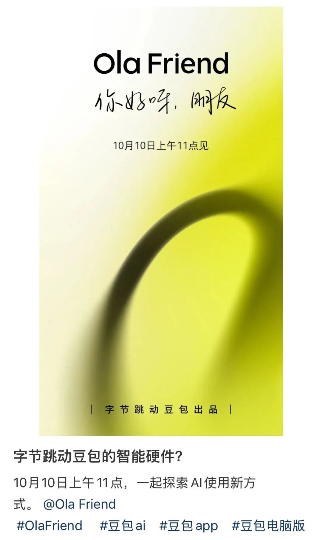 2、字节跳动豆包智能硬件 Ola Friend 预热,预计为智能耳机