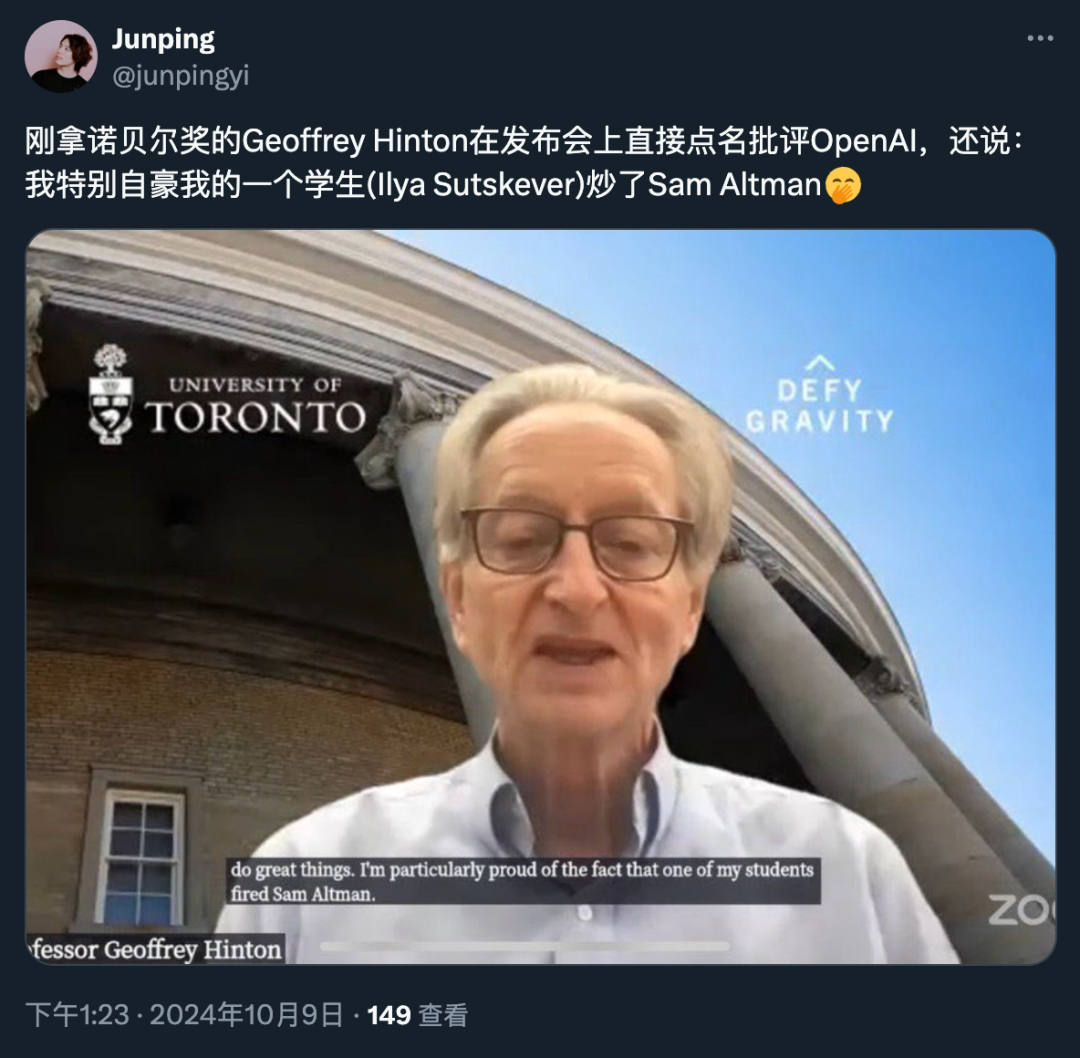 1、诺奖得主 Geoffrey Hinton:我特别自豪我的一个学生炒了 Sam Altman