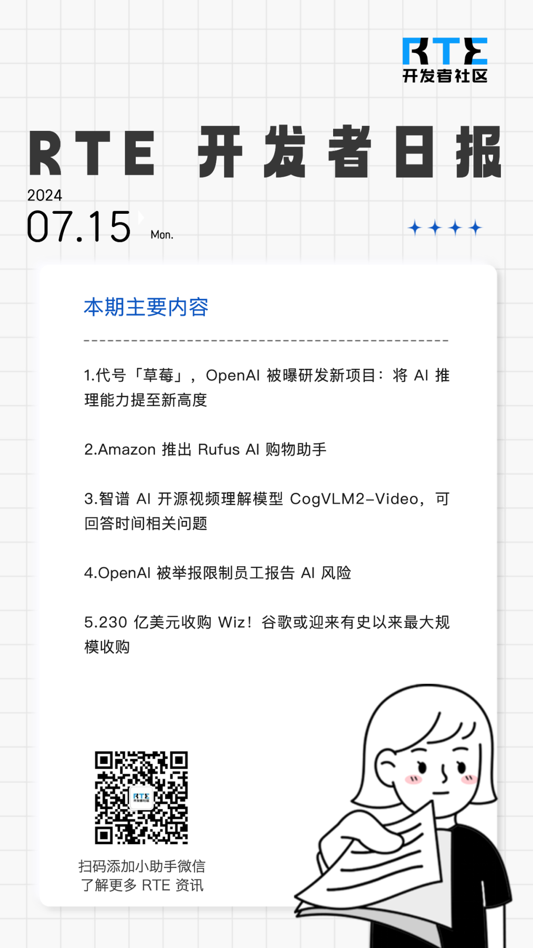 OpenAI 曝新项目「草莓」,提升 AI 推理能力;智谱 AI 开源视频理解模型丨 RTE 开发者日报 RTE开发者社区 发布于 微信公众号