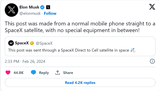 2 月 26 日,伊隆·马斯克旗下太空探索技术公司 SpaceX 宣布,该公司已成功地通过「星链」卫星网络,从太空向社交平台 X 上发布了第一个帖子。