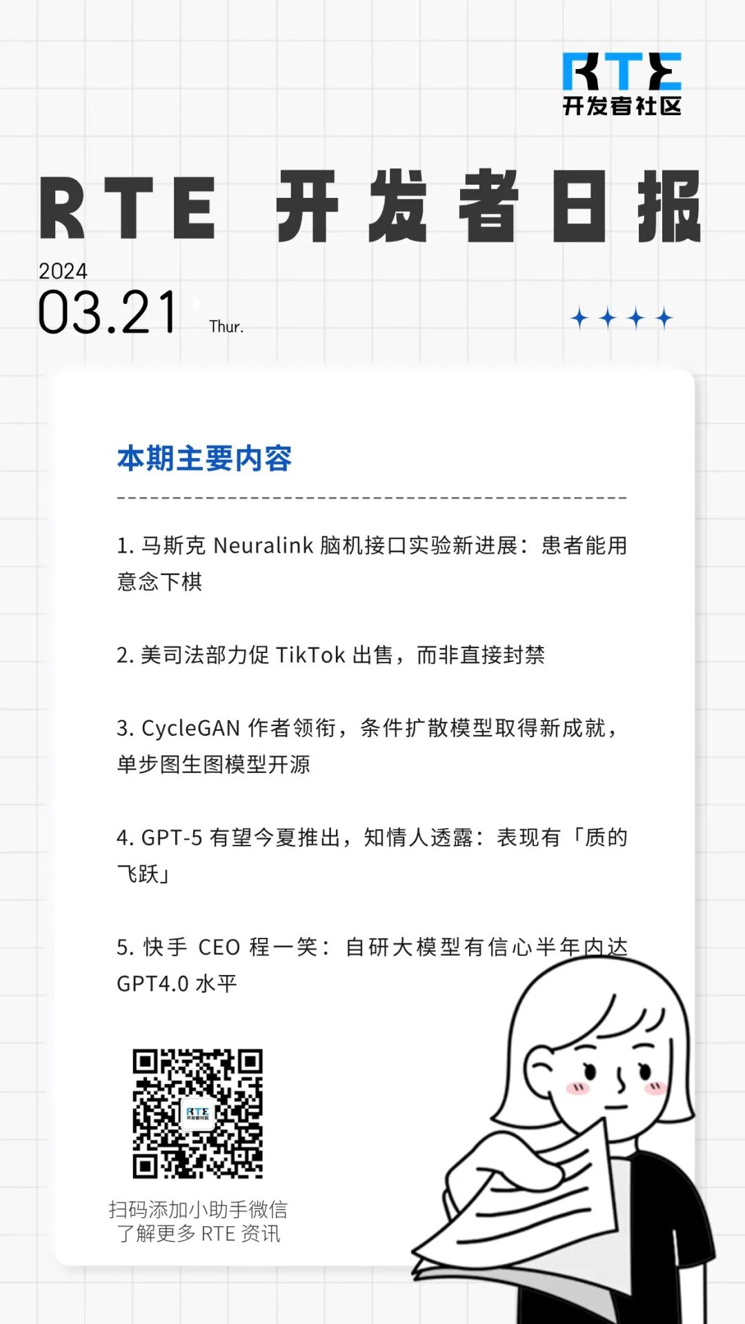 首位脑机患者直播用意念玩游戏;快手自研大模型有信心半年内达 GPT4 水平丨RTE 开发者日报 Vol.169RTE开发者社区 发布于 微信公众号