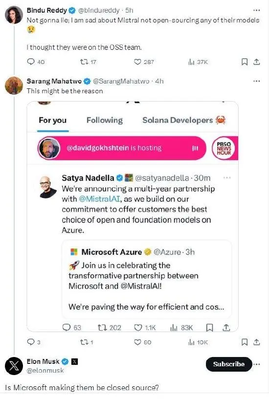 一位?用户发帖称:“我不想说谎,我很遗憾 Mistral 没有开源他们的任何模型。我以为他们是 OSS 团队的。”另一位用户转发了微软 CEO 纳德拉宣布与 Mistral Al 合作的消息,并评论称:“这可能是原因。”马斯克回应称:“是微软让他们闭源的? (@钛媒体)