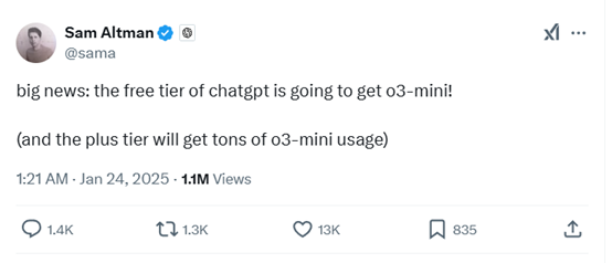 OpenAI 联合创始人兼首席执行官 Sam Altman 宣布了一个大消息——免费版 ChatGPT,将提供 o3-mini 模型。