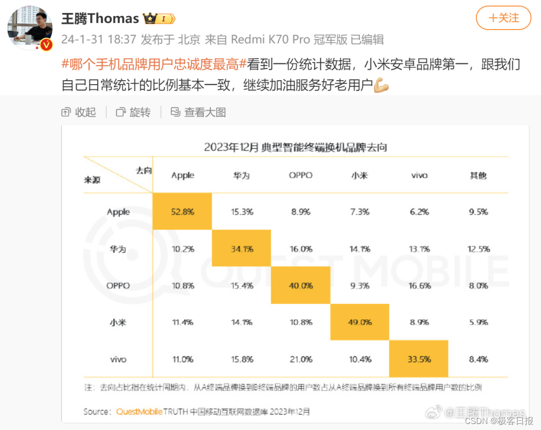 “哪个手机品牌用户忠诚度最高”话题近日引发网友热议。对此,2 月 1 日 Redmi 市场总经理、品牌发言人王腾表示,自己看到一份统计报告,数据显示小米是安卓品牌第一,并补充“跟我们自己日常统计的比例基本一致,继续加油服务好老用户”。