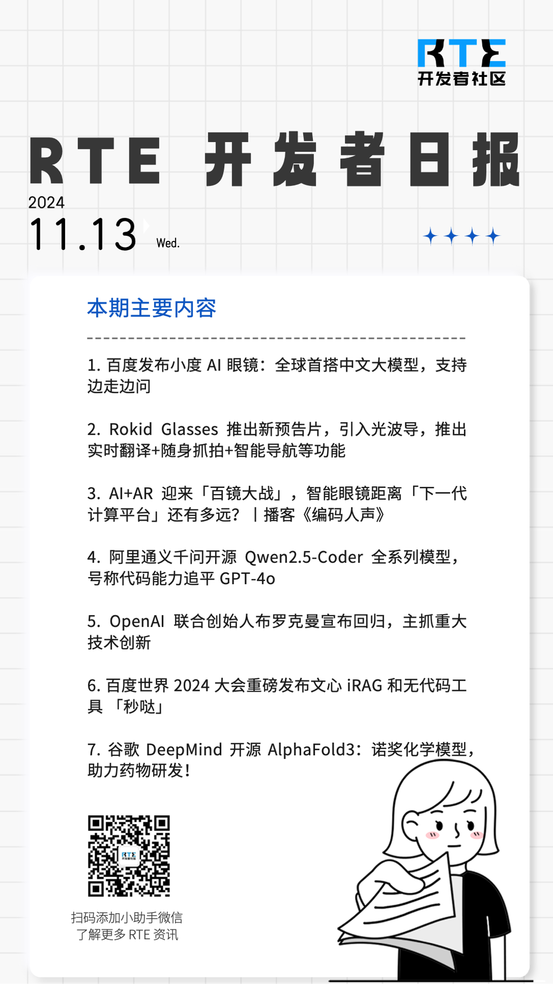 百度发布 AI 眼镜:全球首搭中文大模型,支持边走边问;OpenAI 联合创始人宣布回归,主抓重大技术创新丨 RTE 开发者日报