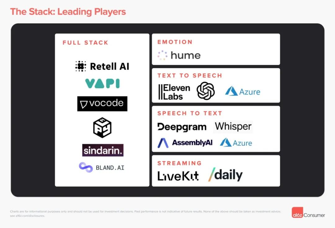 下图是目前在各个技术层面上的一些领先参与者。这份列表并非详尽的市场地图,而是代表了语音助手创始人最常提及的一些名字。