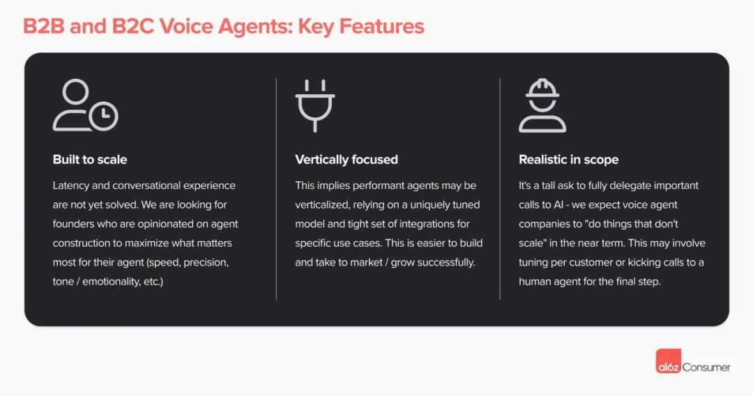 在语音助手的各个层面,都隐藏着巨大的发展机遇——无论是构建基础设施、打造消费者界面还是提供企业级代理服务。针对面向消费者(B2C)和企业(B2B)的语音助手,我们归纳总结出以下关键特征: