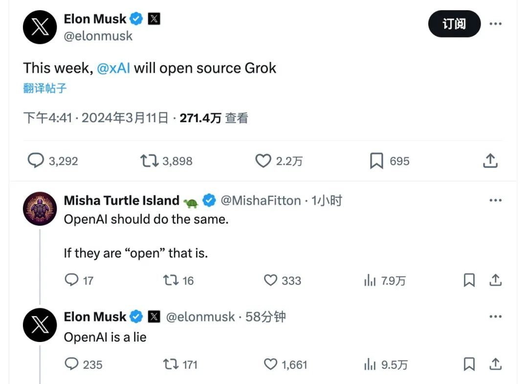 4、继起诉 OpenAI 并要求对方恢复开源后,马斯克宣布本周 xAI 将开源 Grok
