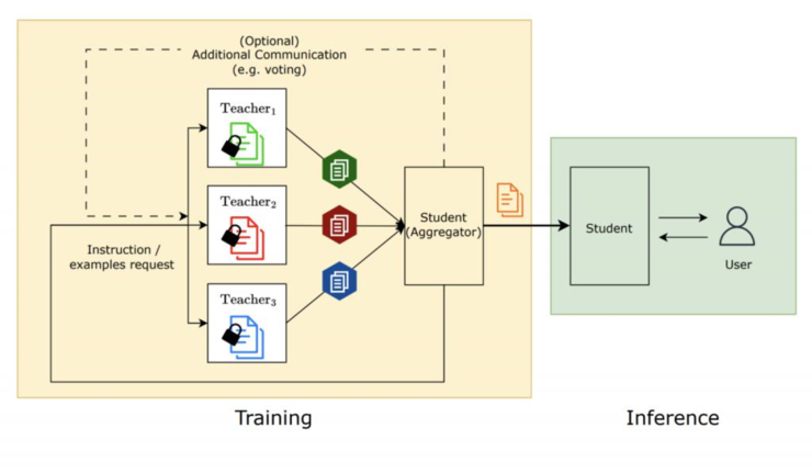 谷歌近日公开了一项名为“社会学习(Social Learning)”的 AI 框架,该框架允许 AI 语言模型能够通过自然语言互相学习,由于不需要直接交换敏感关键信息,因此训练出的 AI 模型更具隐私保护性。据介绍,在这款“社会学习框架”中,“学生模型”会向多个已知特定任务解法的“教师模型”学习各种问题的解决方案,研究人员设计了“垃圾短信检测”、“解决小学数学问题”、“根据特定文字回答问题”等多项测试,来评估相关“社会学习”框架的成效。