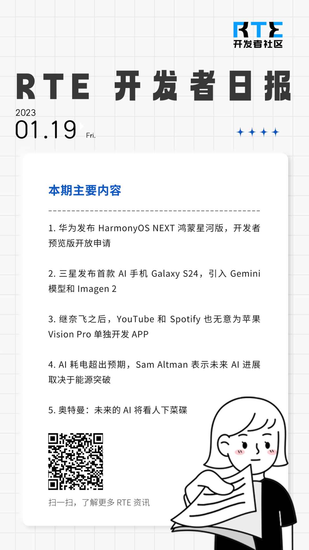1、华为发布 HarmonyOS NEXT 鸿蒙星河版,开发者预览版开放申请 在鸿蒙生态千帆启航仪式上,华为宣布 HarmonyOS NEXT 鸿蒙星河版开发者预览版官网正式上线。为开发者提供了软硬件全栈式线上服务,帮助开发者更好、更快速的开发鸿蒙原生应用,加入鸿蒙生态。其中包括有详细的应用资质审核、鸿蒙生态应用开发白皮书、鸿蒙开发套件、鸿蒙开发教程等等,可为开发者提供学、练、考、证一站式服务。同时华为还公布了“耀星计划”,将投入 70 亿+人民币,持续激励鸿蒙原生应用、元服务、SDK 等生态创新,迅速构建出更强大丰富的鸿蒙生态。(@IT之家) 2、小米首款 5G 卫星移动终端入网 一款型号为 2311BPN23C 的小米卫星移动终端设备已通过电信设备进网许可。信息显示,该设备支持天通卫星通信制式,以及 5G-增强移动宽带(eMBB)技术,搭载安卓系统,这将是小米首款 5G 卫星移动终端。(@财联社) 3、三星发布首款 AI 手机 Galaxy S24,引入 Gemini 模型和 Imagen 2 1 月 18 日凌晨,三星发布了它的首款 AI 手机 Galaxy S24 系列,在高端机型 Galaxy S24/S24+上提供了多种 AI 功能。三星与 Google Cloud 启动一项数年合作计划,从 Galaxy S24 系列三款新机开始,三星成为第一家透过云端将 Vertex AI 平台的 Gemini Pro 和 Imagen 2 部署到智慧手机的 Google Cloud 合作伙伴,也是最早测试 Gemini Ultra 的客户之一。(@品玩) 4、AWS 准备对 IPv4 地址收费 从 2 月 1 日开始,最大的云计算服务商 AWS 将对 IPv4 地址收费,每小时 0.005 美元,每月约 4 美元。原因是 IPv4 地址日益稀缺,获取的成本在增加。每月 4 美元对普通用户可能并不多,但对基于 AWS 的基础设施服务商而言意味着数百万美元的额外开支。这些公司可以选择将成本转嫁给客户,或者提供代理等权宜方法,或者只提供 IPv6。IPv6 的普及度有望加速。(@Solidot) 5、继奈飞之后,YouTube 和 Spotify 也无意为苹果 Vision Pro 单独开发 APP 当地时间 1 月 18 日,YouTube 和音乐流媒体公司 Spotify 表示加入奈飞的行列,都不打算面向苹果公司混合头显设备 Vision Pro 单独开发 APP。Netflix 本周早些时候也表示,Netflix 用户可以通过 Vision Pro 网页浏览器观看内容,公司不会开发专门的应用程序。根据苹果官方信息,Vision Pro 支持的流媒体包括 Apple tv+、Disney+、Max、Amazon Prime Video、TikTok 等,支持的 3D 电影包括《阿凡达:水之道》《沙丘》《复仇者联盟:终局之战》等。(@财联社)
