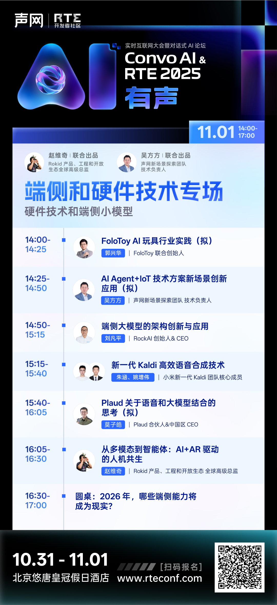Folotoy 联合创始人郭兴华、声网新场景探索团队技术负责人吴方方、RockAI 创始人& CEO 刘凡平、小米新一代 Kaldi 团队核心成员朱涵和姚增伟、Plaud 合伙人&中国区 CEO 莫子皓和 Rokid 产品、工程和开放生态全球高级总监赵维奇等多位硬件和端侧技术专家、开发者和创业者将加入我们,一同探索无所不在的实时互动和空间计算新时代。
