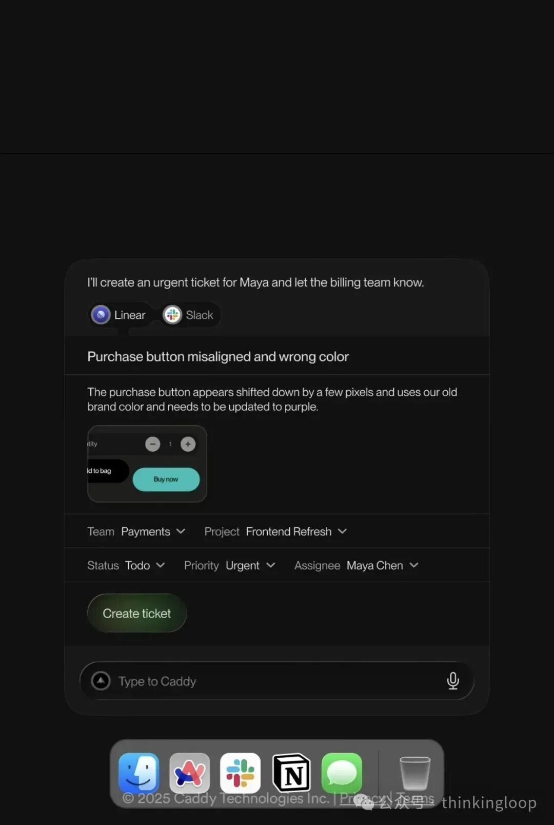 产品: Caddy 打造“工作版 Siri”,让用户用语音完成跨应用的复杂工作流程。简单来说,Caddy 将用户的声音变成计算机的新型输入接口。它能够“读懂”用户屏幕上的内容和当前意图,从而在用户持续专注时自动替用户执行操作。例如,当用户说出“创建一个 Linear 工单并分享给 Slack”这样的指令后,Caddy 会理解上下文并在后台立即于 Linear 中创建工单,再将链接发到 Slack 指定频道,无需用户手动切换应用来回操作。