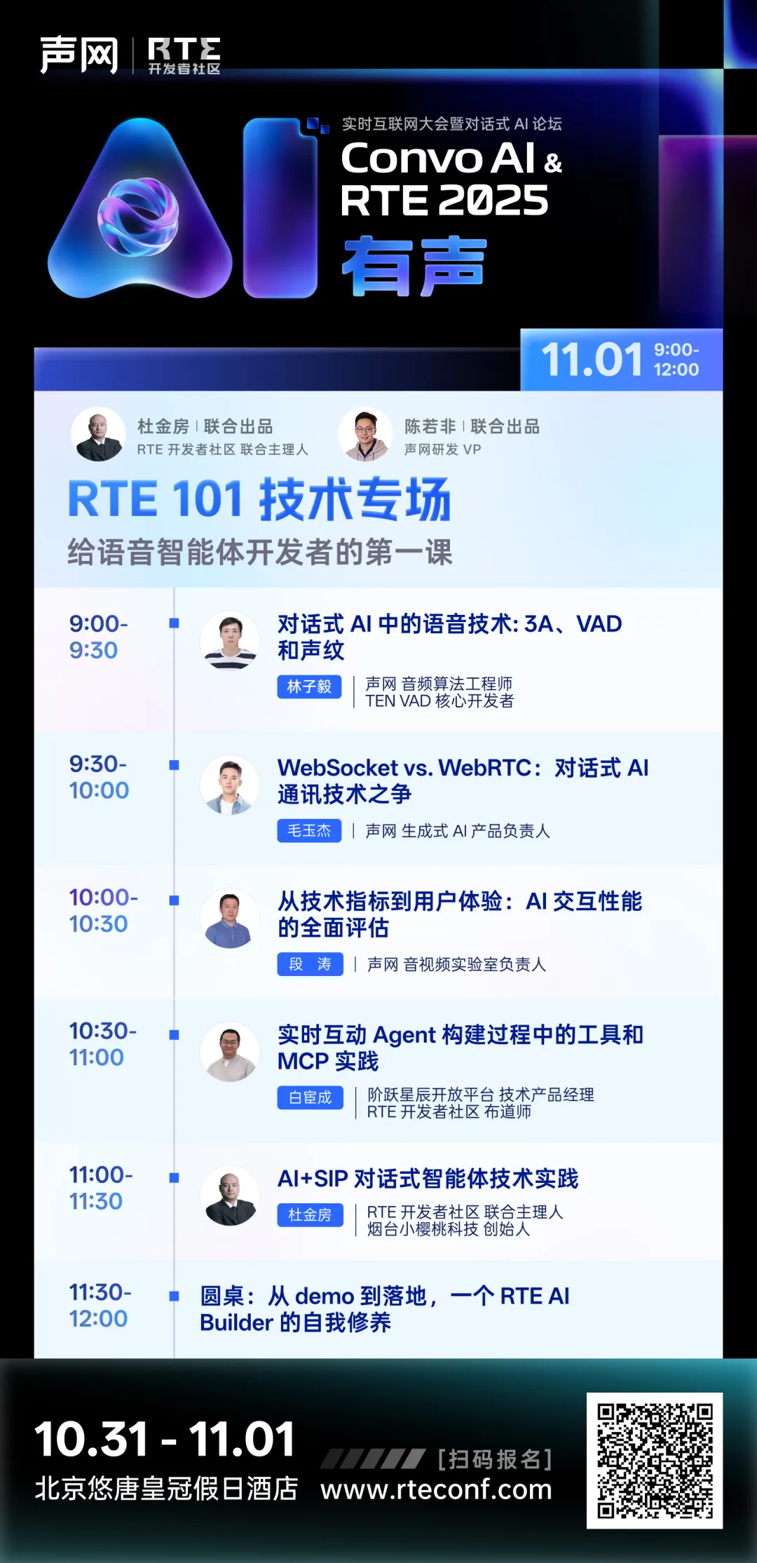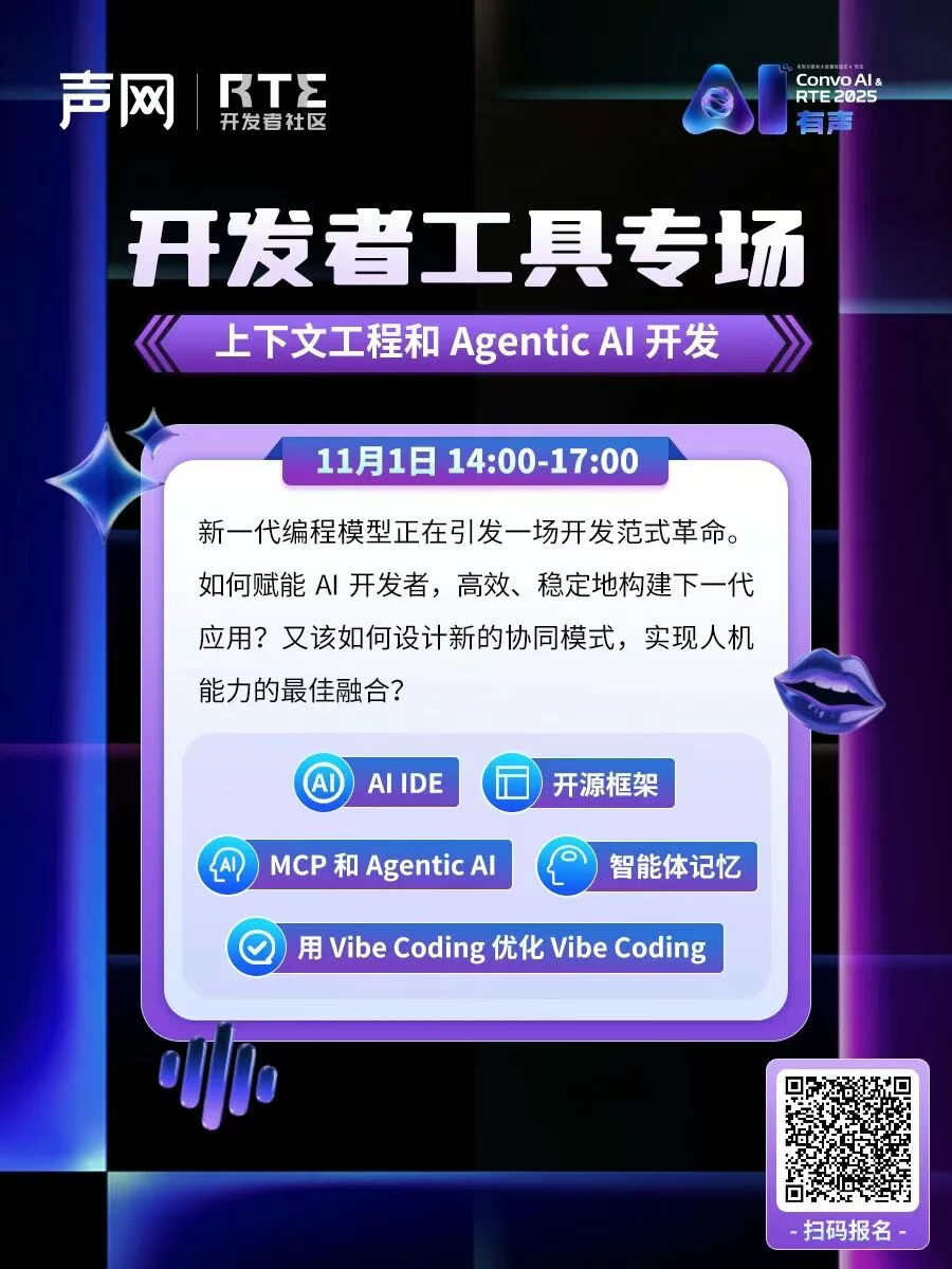 除了本场论坛,你还可以在 10 月 31 日-11 月 1 日,逛遍 7 场技术论坛和 40 多场主题分享和圆桌讨论,一起来探索对话式 AI、Voice Agent、多模态 AI……与 RTE 的碰撞吧!