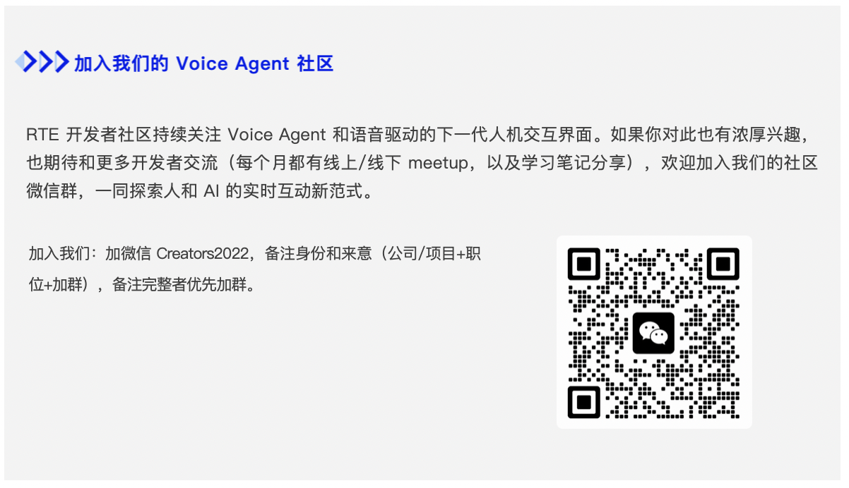 实时互动 × 对话式 AI 的故事才刚开始。欢迎更多对话式 AI 领域的初创项目、投资人和生态伙伴的加入,与 RTE 开发者社区一起重塑人机实时互动体验!想要联系上述项目,或想加入开发者社区合作伙伴者可加微信 Creators2022 咨询,请备注「一句话介绍+demo day」