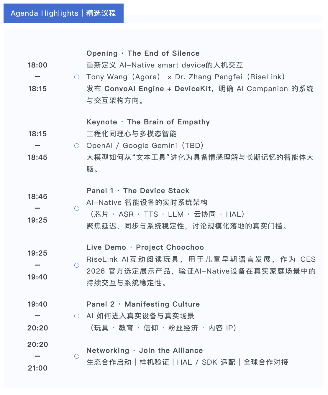 晚宴现场将演示基于 Agora ConvoAI DeviceKit 架构,验证芯片、实时交互与对话式 AI 在真实使用条件下的稳定协同与量产可行性。